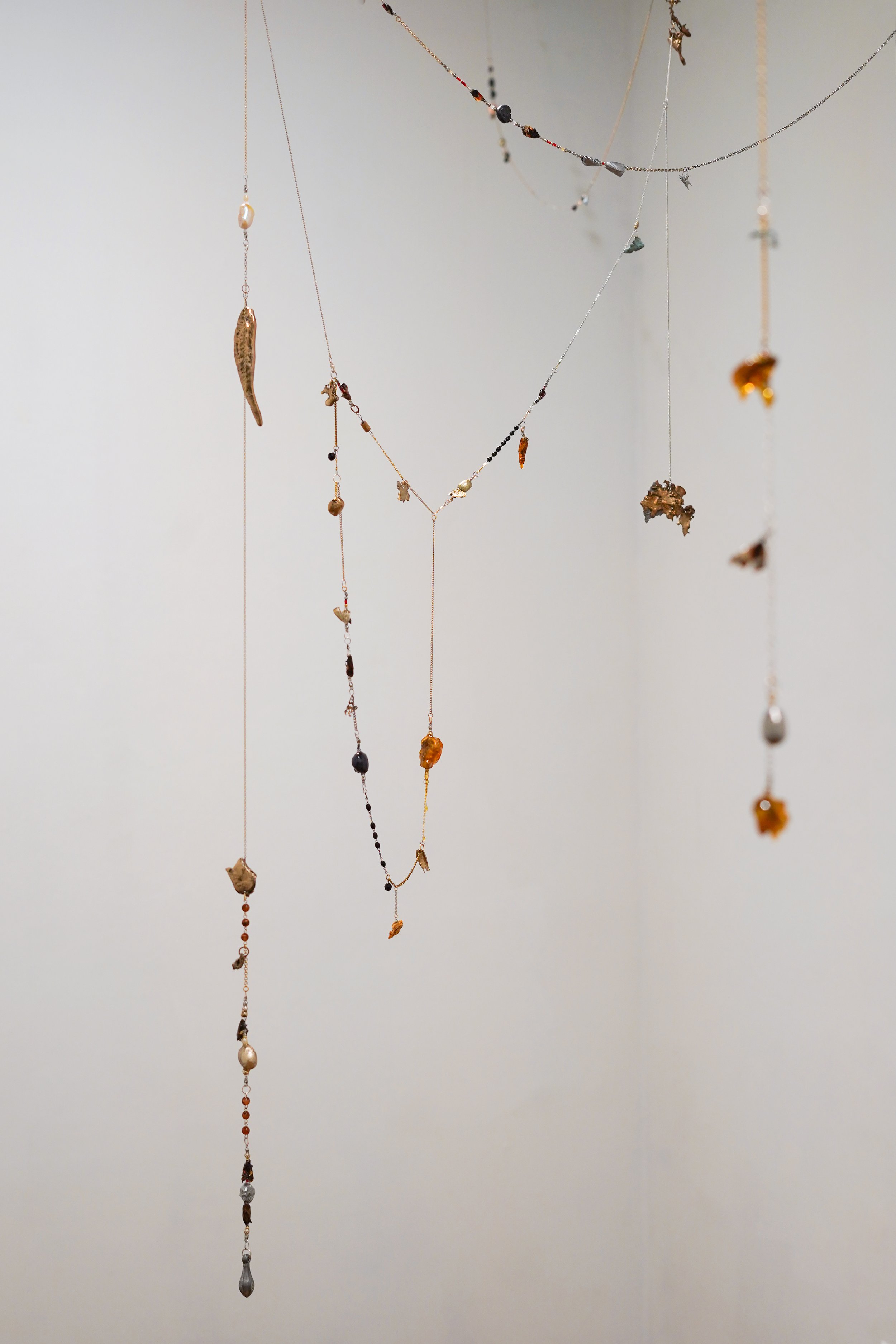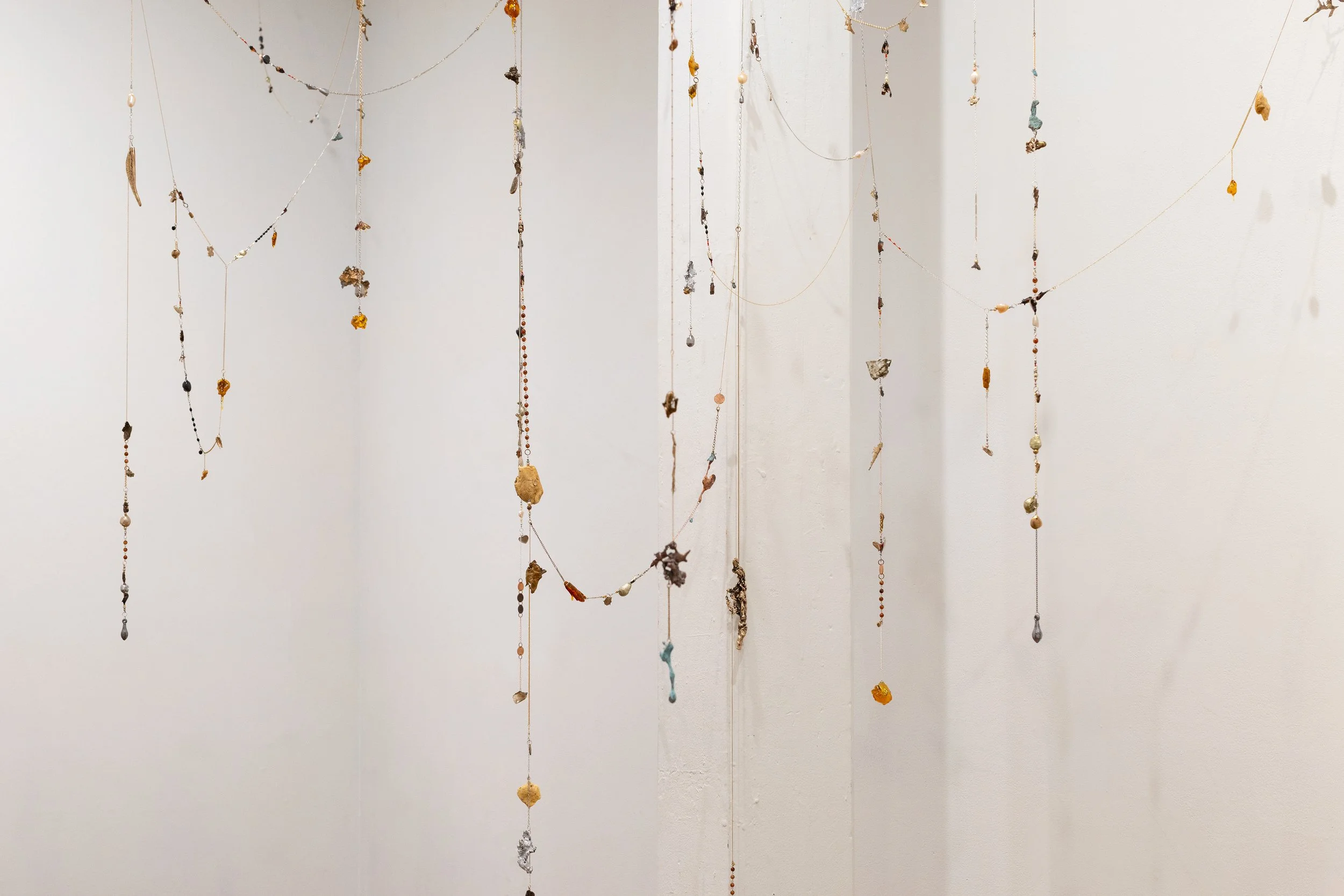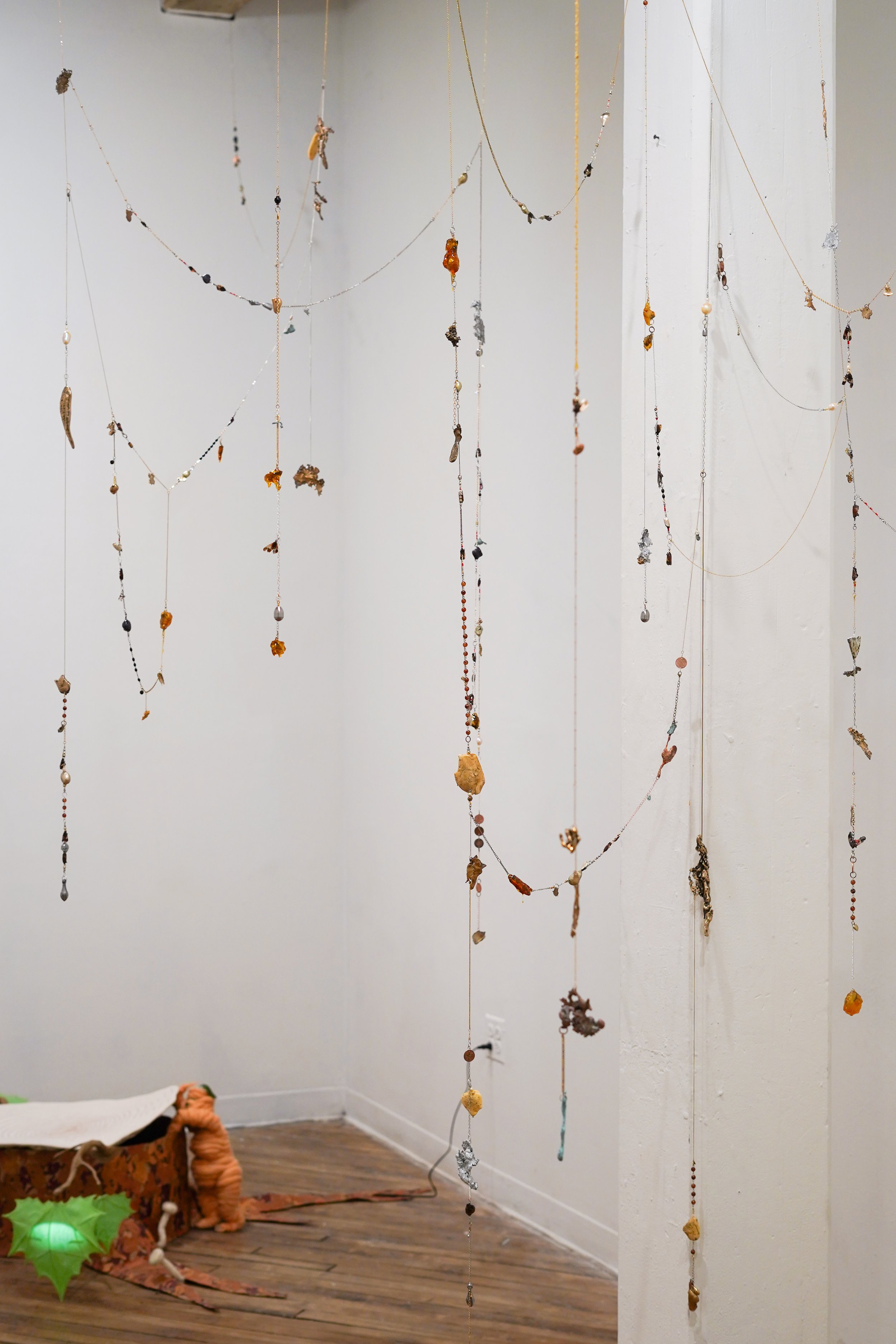 Tangled, trailing, and glinting in the dim light, Erin Mallea’s installation Condition Report suspends the remnants of industry, consumption, and ecological transformation in a delicate choreography. Here, aluminum and bronze slag—cast-off ghosts of manufacture—commingle with the ornamentation of bygone adornments. Pennies, relics of exchange, and nurdles (embryonic plastics washed ashore) whisper of a world shaped by extraction and excess. The spotted lantern fly, sealed in beeswax and lacquer, is less an ecological threat than a vessel for human anxiety, its vilification exposing the impulse to cast nature as an enemy to be controlled. In this constellation of waste and ornament, it becomes a cipher for hysteria—its image shimmering with imposed meaning. Like dust collecting in a room or visions snagged in the corners of sleep, these remnants insist on their presence, weaving together a suspended interior. Waste hums with a lingering life.”