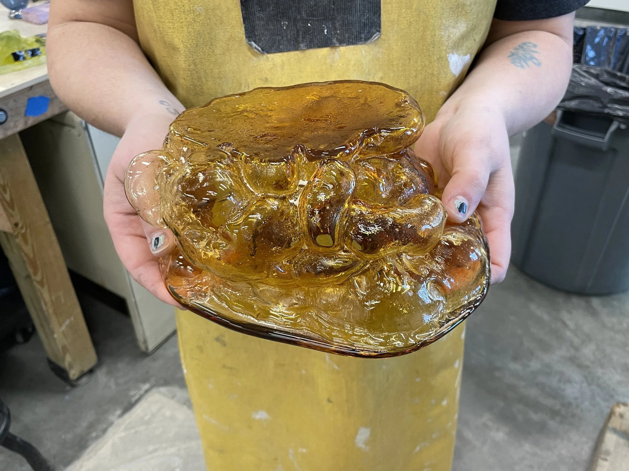 I’ve been working at the Pittsburgh Glass Center starting in January 2025 to continue work I began in 2022 with the help of the Idea Furnace Residency. This winter I made nine new molds for casting and blowing glass and demolded them in March and April. I’m currently focused am now onto cleaning, finishing and polishing. I’m slowly conceptualizing the glass tumors/growths as they expand from Permissible Dose into new configurations and relationships.